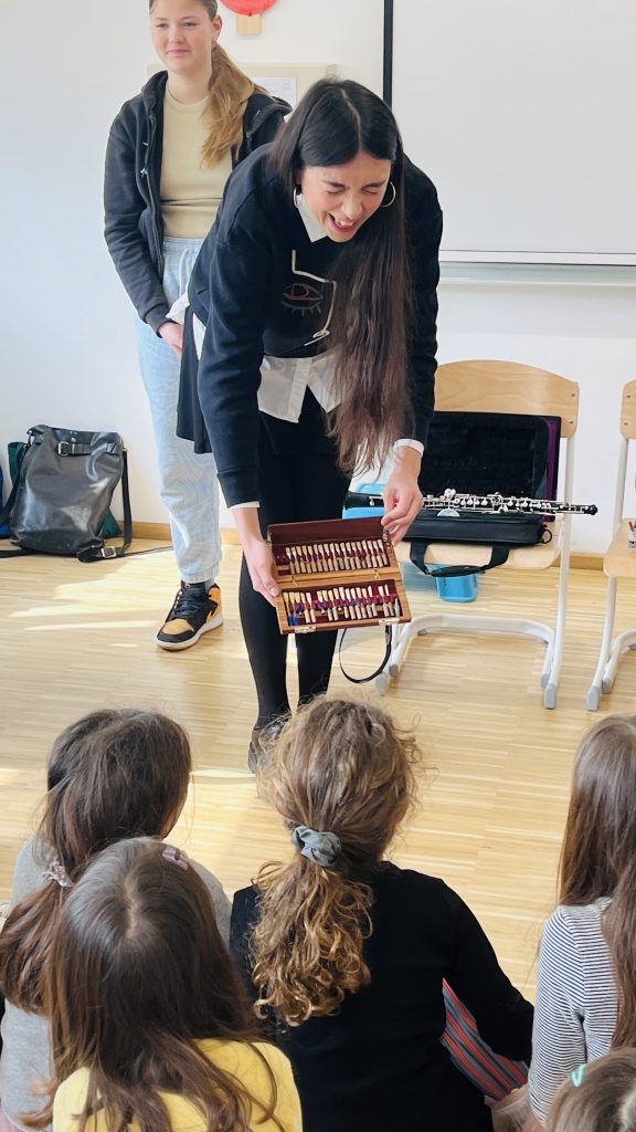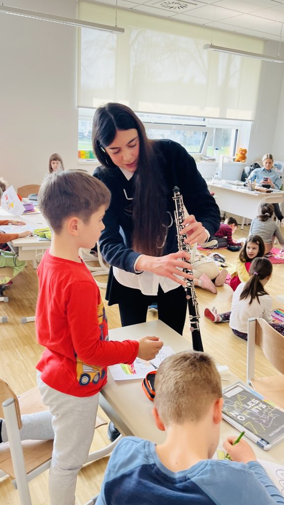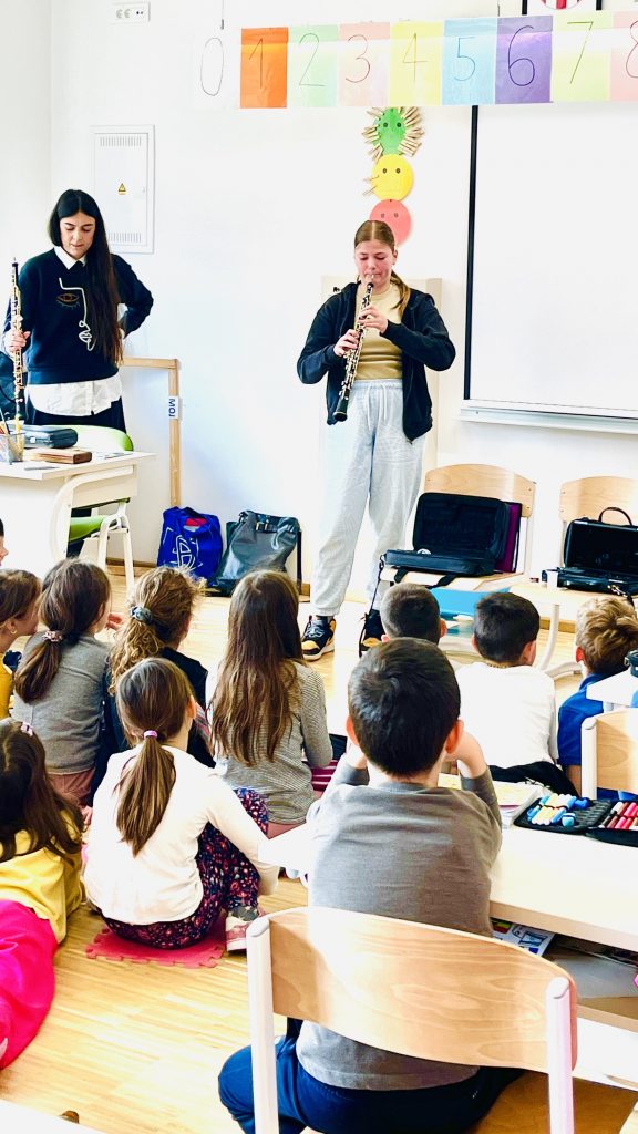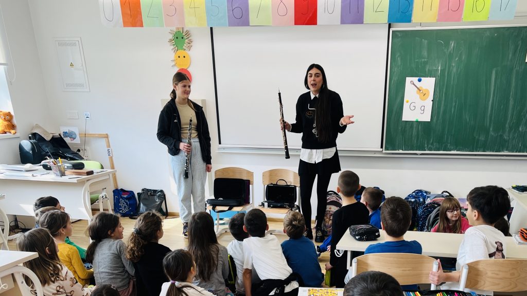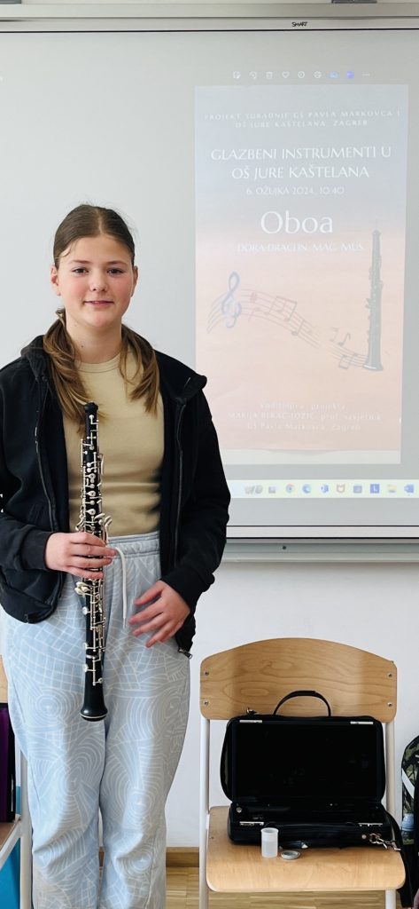 U okviru predstavljanja glazbenih instrumenata u OŠ Jure Kaštelana nastavnica oboe Dora Draclin, mag. mus., i učenica Jelena Jurić, 4. o., održale su predstavljanje svog instrumenta učenicima prvih razreda i njihovim učiteljicama.