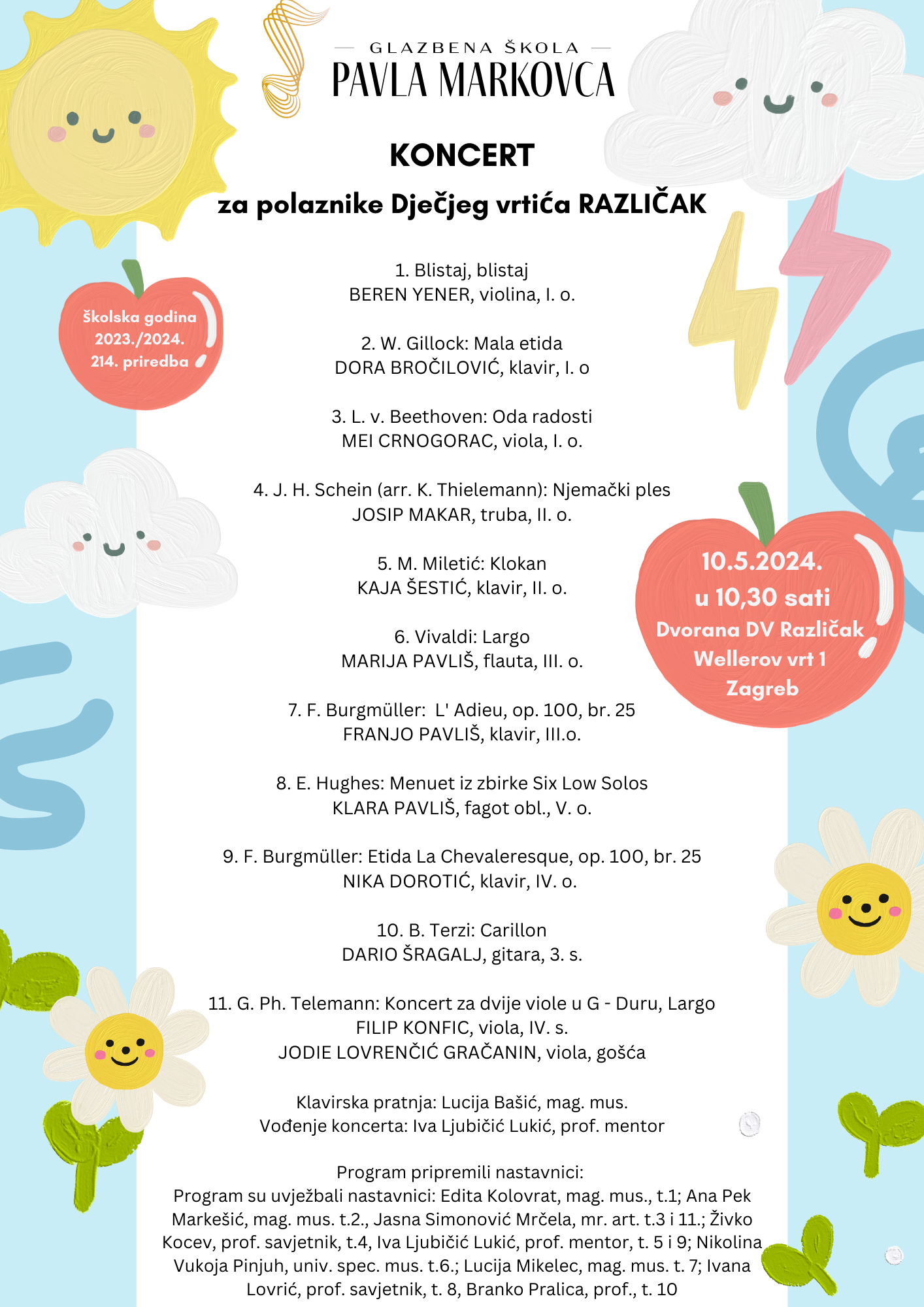 Program je vodila prof. Iva Ljubičić Lukić, a nakon koncerta djeca su imala priliku isprobati instrumente trubu, violinu i klavir uz profesorice Anu Korade, prof. trube, Editu Kolovrat, prof. violine te profesorice klavira Luciju Mikelec i Anu Pek.