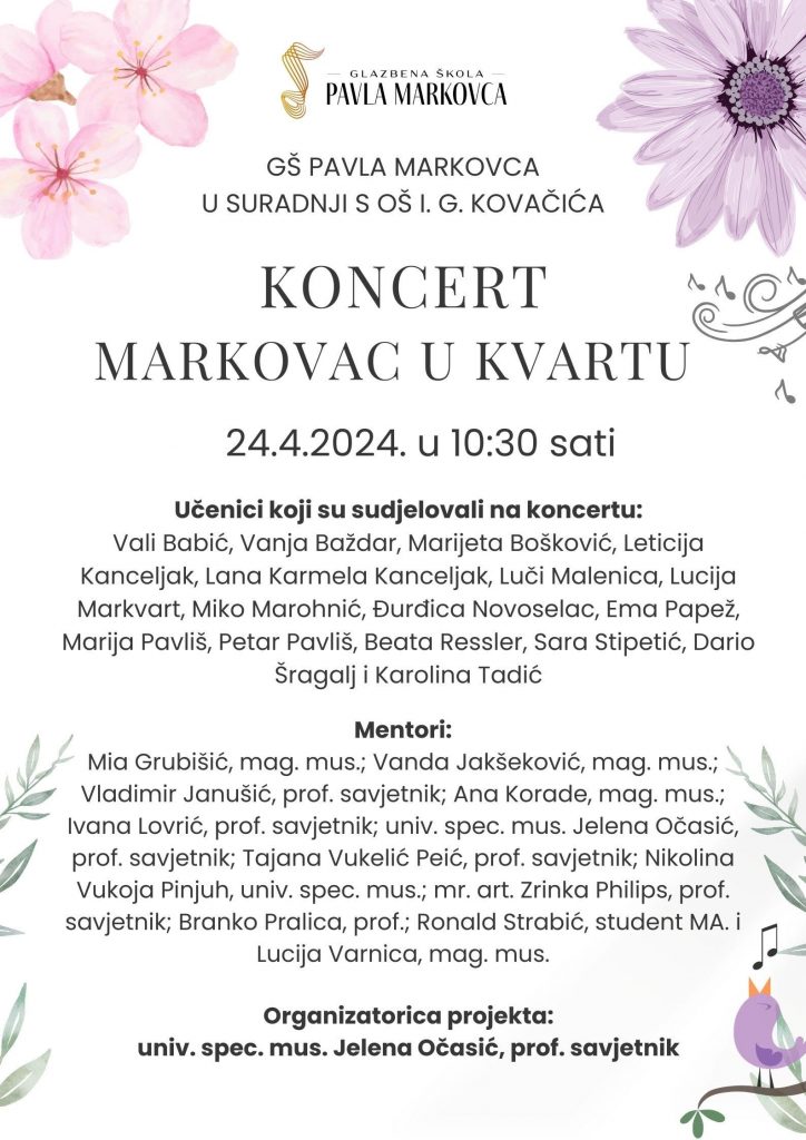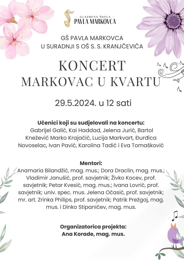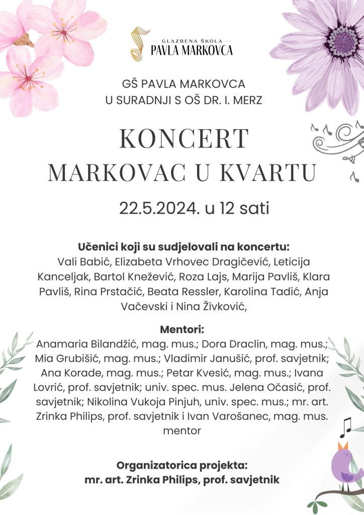 I ove školske godine u sklopu projekta “Markovac u kvartu” učenici naše škole održali su tri koncerta u školama: OŠ I. G. Kovačića, OŠ. Dr. I. Merz i OŠ S. S. Kranjčevića.