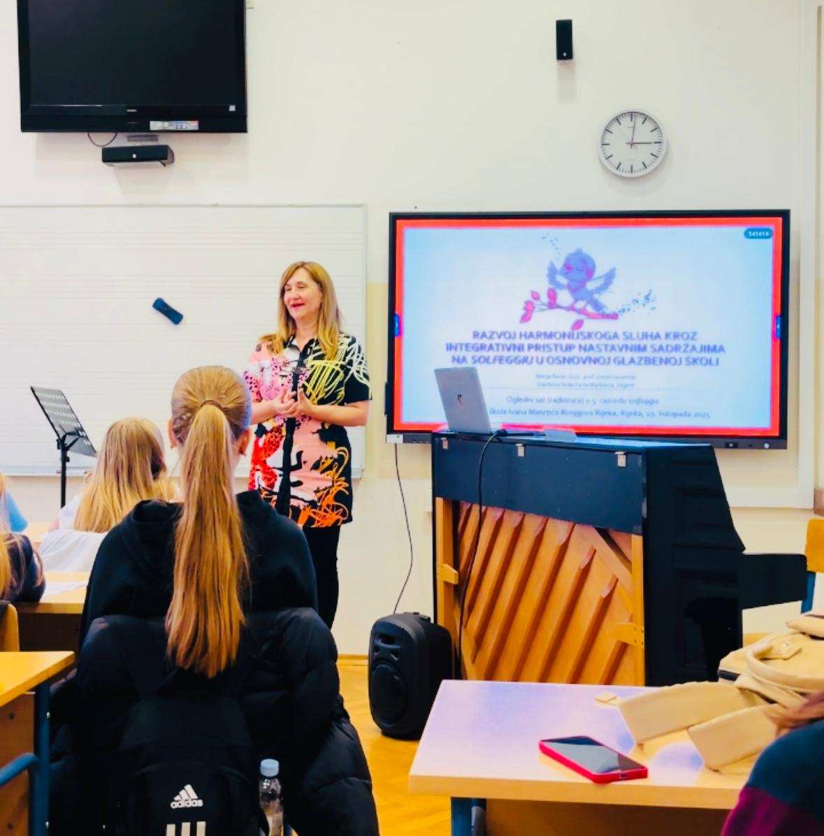 Nastavnica Marija Berać-Jozić, prof. izvrstan savjetnik, na poziv Doris Kovačić, prof., pročelnice Teorijskog odjela GŠ Ivana Matetića Ronjgova u Rijeci, održala je za nastavnike teorijskog odjela radionicu i predavanje na temu: „Razvoj harmijskoga sluha kroz integrativni pristup nastavnim sadržajima na solfeggiu u osnovnoj glazbenoj školi“, a učenici 5. razreda solfeggia aktivnim sudjelovanjem u radionici pokazali su zavidnu razinu znanja, motivacije, predanosti i ljubavi prema glazbi.