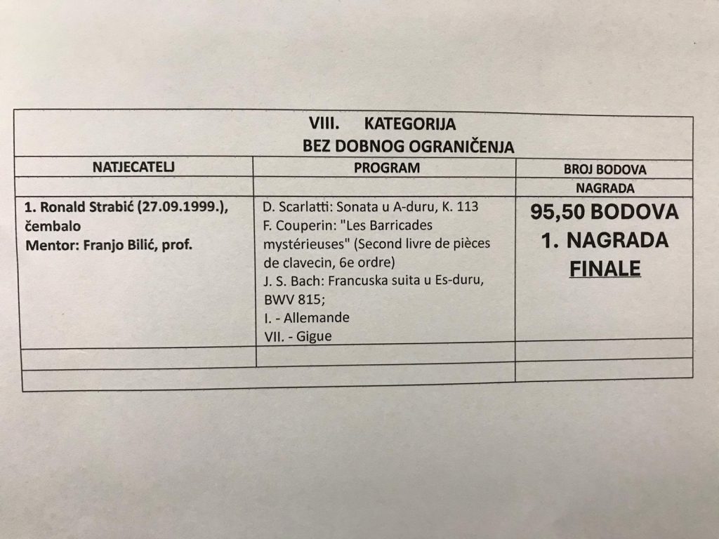 S ponosom objavljujemo da je Ronald Strabić, učenik čembala obligatno, osvojio 1. nagradu na međunarodnom glazbenom natjecanju „Dugoselski Nocturno“, u konkurenciji miješanih godišta i instrumenata.